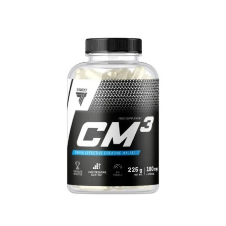 Trec CM3 - wysokiej jakości jabłczan kreatyny o czystym składzie. Nie znajdziesz w nim żadnych przypadkowych dodatków i zastrzeżonych mieszanek. Pomaga w uzyskaniu maksymalnie możliwych na dany moment efektów w postaci przyrostu suchej tkanki mięśniowej, jak i w podniesieniu ogólnej tężyzny organizmu. Odpowiednio wykorzystany potencjał kreatyny sprzyja poprawie wydolności fizycznej, szczególnie w przypadku następujących po sobie krótkich, bardzo intensywnych ćwiczeń fizycznych. Jabłczan jest stabilniejszy od monohydratu, co oznacza wolniejszą konwersję do nieaktywnej kreatyniny w środowisku wodnym. Oczywiście w dalszym ciągu należy porcję przyjmować zaraz po przygotowaniu (jeżeli stosujesz proszek). Sprawdzi się w przypadku wszystkich osób aktywnych fizycznie, niezależnie od ich stopnia zaawansowania, jak i numeru cyklu kreatynowego.