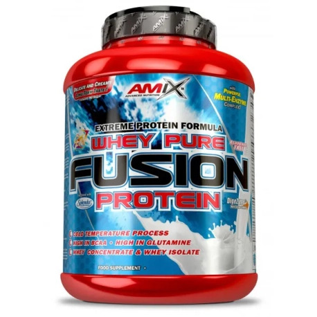 Amix Whey Pure Fusion to wysokiej jakości białko serwatkowe o wyśmienitym smaku, bez aspartamu. Składa się w 75% z czystego koncentratu białka serwatki WPC oraz Izolatu serwatki CFM o wysokiej wartości biologicznej. Białko serwatkowe jest łatwo i szybko trawione przez organizm, ma dużą zawartość BCAA oraz L-glutaminy, jest w stanie zatrzymać proces katabolizmu rozpoczynając syntezę białek w organizmie. Wpływa na szybki wzrost i przyspiesza regenerację, do tego ma pyszny kremowy smak!