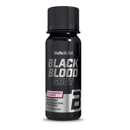 BioTech Black Blood Shot to suplement diety w postaci shota zawierający beta-alaninę, taurynę, L-tyrozynę, kofeinę oraz wyciąg z liści zielonej herbaty (Camellia sinensis).
