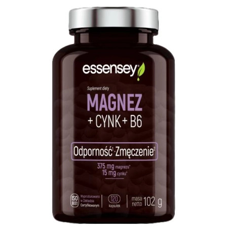 Essensey Magnez+Cynk+B6 - profesjonalny suplement na bazie trzech bardzo istotnych dla organizmu mikroelementów, a konkretnie: magnezu, cynku oraz witaminy B6, której wpływ na metabolizm, jak i szeroko rozumianą gospodarkę energetyczną jest olbrzymi. Formuła produktu została oparta o starannie wyselekcjonowane i dobrze przyswajalne formy chemiczne wspomnianych mikroelementów. Warto podkreślić, ze ich poszczególne dawki i wzajemne proporcje także nie są dziełem przypadku. Sięgając po ten produkt, zapewnisz swojemu organizmowi realne wsparcie w sprawnym uzupełnieniu ich niedostatecznej podaży w codziennej diecie. Formuła jest wolna od przypadkowych i zbędnych dodatków, dzięki czemu wiesz, co i w jakiej ilości suplementujesz. Znajdujący się w składzie magnez wpływa między innymi na ograniczenie uczucia zmęczenia i znużenia, sprzyja utrzymaniu równowagi elektrolitowej, ale i prawidłowemu przebiegowi procesów energetycznych organizmu. Nie można zapominać o pozytywnym wpływie na układ nerwowy, jak i na prawidłową pracę tkanki mięśniowej. Natomiast cynk przyczynia się do zachowaniu odpowiedniego metabolizmu substancji odżywczych, uczestniczy w syntezie białka ludzkiego, wspiera układ immunologiczny (odpornościowy), jak i stymuluje do odpowiedniej pracy układ hormonalny. Cynk jest także silnym antyoksydantem, wspomaga wzrok oraz utrzymanie prawidłowego poziomu testosteronu we krwi.
