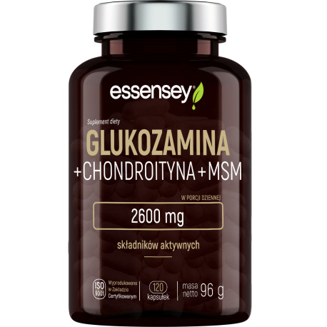 Essensey Glukozamina + Chondroityna + MSM - profesjonalny produkt skierowany do osób aktywnych fizycznie, których celem jest optymalizacja procesów regeneracji stawów. Łączy w sobie zalety trzech starannie dobranych składników aktywnych, których właściwości są znane i cenione, a mianowicie: siarczanu glukozaminy, chondroitynę oraz MSM (metylosulfynylometanu) będącego doskonałym źródłem siarki organicznej. Charakteryzuje się odpowiednio dobranymi dawkami, dzięki czemu pomaga w zachowaniu pełnej mobilności układu ruchu, co jest bardzo istotne z punktu widzenia każdego sportowca. Formuła wolna jest od przypadkowych dodatków, wystarczy spojrzeć na etykietę, by przekonać się z jak znakomitym suplementem ma się do czynienia. Może być z powodzeniem stosowany przez wszystkie osoby aktywne, niezależnie od stopnia zaawansowania. Produkt występuje w postaci kapsułek, których rozmiar nie będzie problemem podczas połykania.