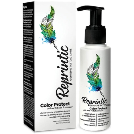 Aflofarm Reprintic Pielęgnacja Krem - jest to wyjątkowo skuteczny krem stworzony z myślą o pielęgnacji tatuaży oraz makijażu permanentnego. Może być stosowany codziennie celem przywrócenia pierwotnej kolorystyki skórze, chroni tatuaże przed wyblaknięciem w wyniku szkodliwego działania promieni UV. Bardzo dobrze się nakłada i bezproblemowo rozprowadza, przy jednoczesnym szybkim wchłanianiu. Pozostawia po sobie ciekawy zapach.