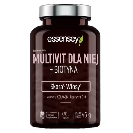 Essensey Multivit dla niej - dzięki niemu nie tylko łatwo, ale i skutecznie wesprzesz swój organizm i zapewnisz mu odpowiednią podaż najważniejszych witamin. Charakteryzuje się znakomitą przyswajalnością starannie skomponowanej mieszanki witamin, ale i wielu wartościowych dodatków mających wpływ na stan organizmu i piękno kobiecego organizmu. Warto wyróżnić opatentowaną formułę kolagenu, CLA (sprzężony kwas linolowy), l-karnitynę oraz ekstrakt z liści zielonej herbaty będący źródłem wielu antyoksydantów, ale i termogenicznego EGCG.
