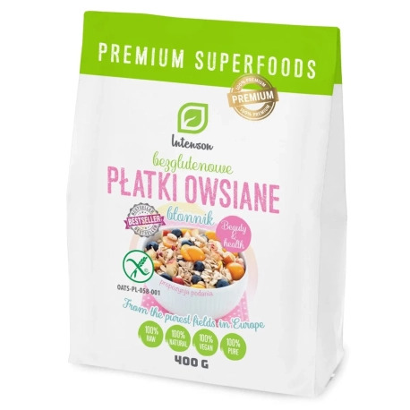 Intenson Bezglutenowe płatki owsiane otrzymywane są z kaszy owsianej. Najczęściej służą do przygotowania tradycyjnej owsianki spożywanej zazwyczaj na śniadanie. Zawierają dużą ilość błonnika, który wpływa pozytywnie na układ pokarmowy, regulując pracę jelit. Dostarczają wartościowych protein niezbędnych do prawidłowej regeneracji i rozwoju komórek. Instytut Żywności i Żywienia zaleca, aby białko stanowiło 10 – 15% dobowego zapotrzebowania na energię.