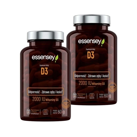 Essensey D3 - najwyższej jakości suplement na bazie witaminy D3, której w każdej porcji znajdziesz aż 2000IU, co odpowiada 50mcg cholekalcyferolu. Charakteryzuje się dobrą biodostępnością/przyswajalnością oraz czystym i klarownym składem. Formuła jest wolna od zastrzeżonych mieszanek, jak i zbędnych dodatków. Dzięki temu zawsze wiesz, ile witaminy D3 suplementujesz. Pomaga w utrzymaniu odpowiedniej podaży tej niezwykle istotnej dla układu kostnego, jak i odporności organizmu witaminy. Warto zdać sobie sprawę, że wpływa także na prawidłowe funkcjonowanie tkanki mięśniowej, układu immunologicznego, ale i na odpowiednie wykorzystanie wapnia oraz fosforu przez organizm. Polecany jest wszystkim osobom poszukującym solidnego i pewnego źródła witaminy D3 celem uzupełnienia niedostatków w swojej diecie. Wszystko to w postaci kapsułek ułatwiających precyzyjne odmierzenie każdej porcji.